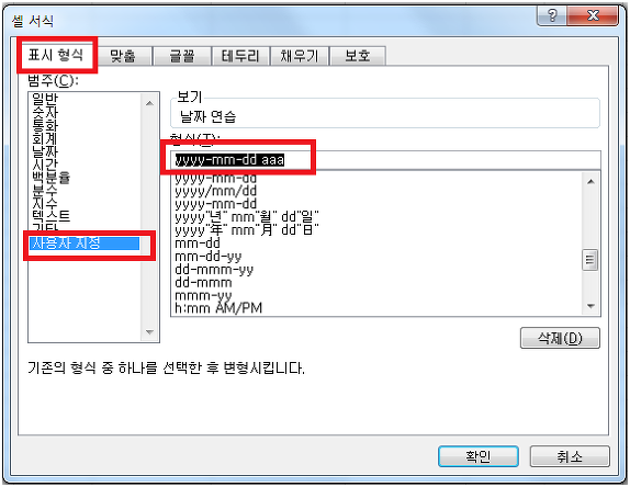 또는 사용자가 직접 날짜 서식을 만들어 사용할수도 있습니다.