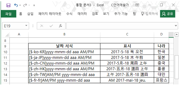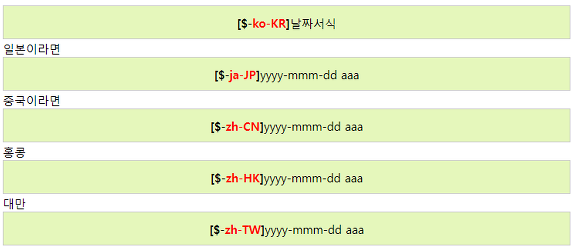 예를들어 한국 국가 코드는 Ko-Kr인데 날짜 서식을 다음과 같이 써주면됩니다.
