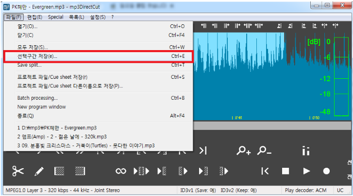 그런다음 상단에 파일-선택구간저장(e) 메뉴를 선택하면