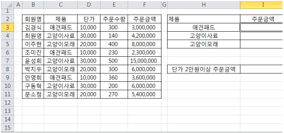 이 리스트를 토대로 주문금액의 합계와 단가가 2만원 이상인 제품의 판매금액 합계를